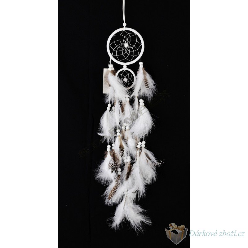 Lapač zlých snůPrůměry největšího kruhu: 11cm Materiál: bavlna, peří, korálky. Použití lapače pro feng shui: slouží jako ochranný symbol a regulátor proudění energie chi. Umístění lapače dle využití: