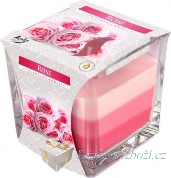 Svíčka vonná tříbarevná ve skleKvalitní svíčka vonná ve skle s dlouhou dobou hoření a příjemnou vůní růžeVhodné i jako dárekDelka hoření až 32 hodin.Rozměry: 8,0 x 8,0 x 8,0 cmAroma: Růže