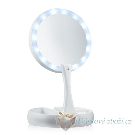 Oboustranné zrcátko s LED osvětlením s 10-ti násobným zvětšenímToto skládací zrcátko lze velice jednoduše složit. Používat jej můžete v jakémkoli prostoru. Obsahuje vlastní stojan, který lze otáčet. Zrcátko je oboustranné – jedna strana poskytuje reálný obraz obličeje, druhá strana jej 10 x zvětší. Na spodní straně zrcátka je tlačítko, díky kterému můžete obě strany zrcátka osvítit LED diodami. Pokud je zrcátko rozložené, na stojánku vzniknou prostory, kam můžete odkládat různé drobné doplňky.