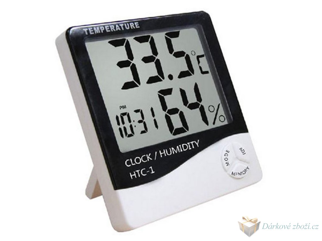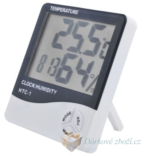 LCD digitální teploměr, vlhkomět, hodiny, budíkTeploměr s měřením vnitřní teploty, vlhkosti s hodinami, datem a alarmem! Jasný LCD displej zobrazující vnitřní teplotu, hodiny / datum a vlhkost. Zobrazení teploty ve stupních C / F Možnost zapamatování nejvyšší a nejnižší teploty Má podporu pro umístění na stůl a rukojeť pro zavěšení na zeď Teplotní rozsah: -10 až 50 ° C (-14 až +122 F) Rozsah naměřené vlhkosti: 10% až 99% relativní vlhkosti Dvě časové rozmezí zobrazení: 12h nebo 24h Funkce alarmu Napájení: 1 x baterie AAA (volně v sadě) Rozměry displeje: 8 cm x 6 cm Výrobek je certifikován CE Rozměry teploměru: Šířka: 9,7 cm Výška: 10 cm Tloušťka: 2 cm Souprava obsahuje: Elektronický teploměr 1x Baterie 1 x AAA Originální balení