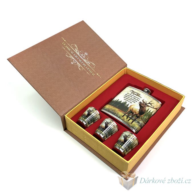 Dárková sada Placatka s motivem JelenaPlacatka na alkohol o objemu 210 ml je vyrobena z nerezu s vnější úpravou v mysliveckém motivu jelena. V zimě na horách či v mokru na vodě, na výletě v přírodě, na rybách pro Vás bude nepostradatelným společníkem. Vhodná jako dárek pro Vaše přátele, při degustaci domácí pálenky apod. Uzávěr placatky je upevněn na pohyblivém kloubu, takže se Vám nemůže ztratit. Tuto placatku získáte ve stylové dárkové kazetě, ve které se dále nacházejí tři nerezové panáky ve stejném motivu. Text na placatce: It is perseverance trough the valley that helps you appreciate the splendor of the mountain top. (Je to vytrvalost v údolí, která ti pomůže ocenit nádheru vrcholu hory.) |