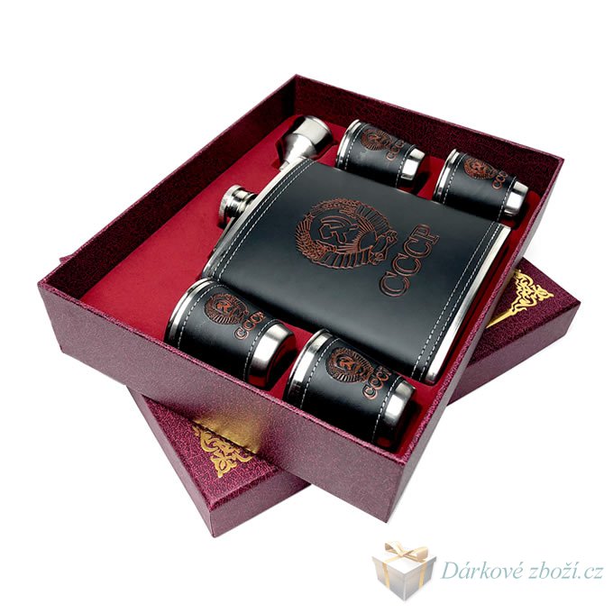 Dárková sada Placatka větší CCCPVelká placatka na alkohol o objemu 540 ml je vyrobena z nerezu pozažena koženkou s vyraženým symbolem CCCP. V zimě na horách či v mokru na vodě, na výletě v přírodě, na rybách pro Vás bude nepostradatelným společníkem. Vhodná jako dárek pro Vaše přátele, při degustaci domácí pálenky apod. Uzávěr placatky je upevněn na pohyblivém kloubu, takže se Vám nemůže ztratit.